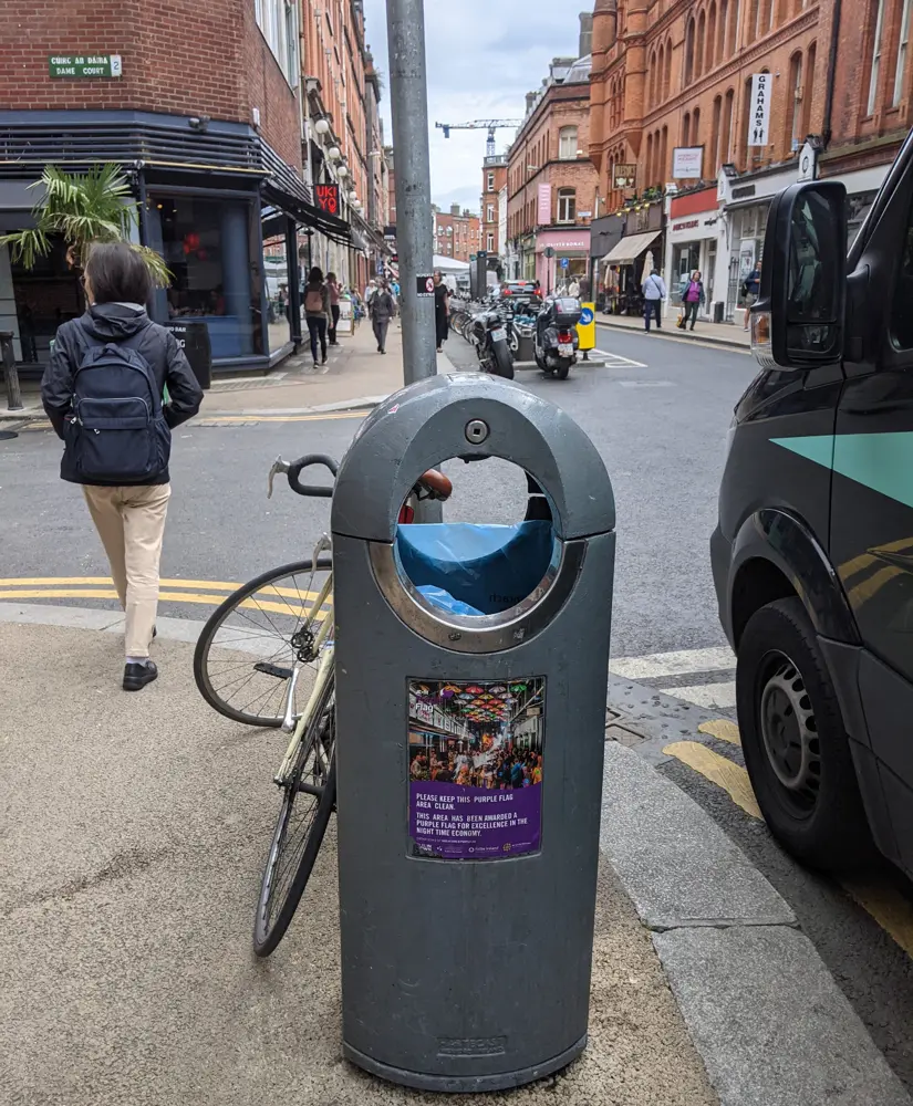 ダブリンの街中に置いてある公共のゴミ箱。左手の角にあるのは日本食レストランバー UKIYO(浮世)。この写真を撮ったあとランチをしました。