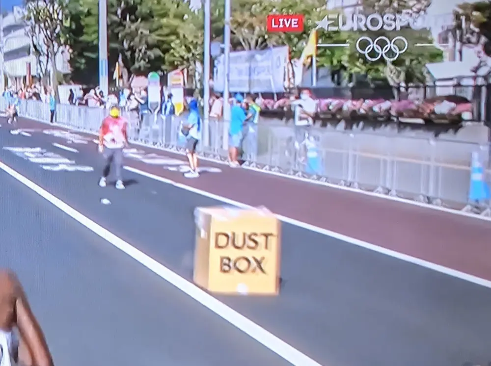 ゴミ箱だとわからなかったから、余計に選手は使っていなかったのか。むしろ混乱させただけかもしれない。パラリンピックでのマラソンの際には、「Dust box」はやめた方がいいと思う。