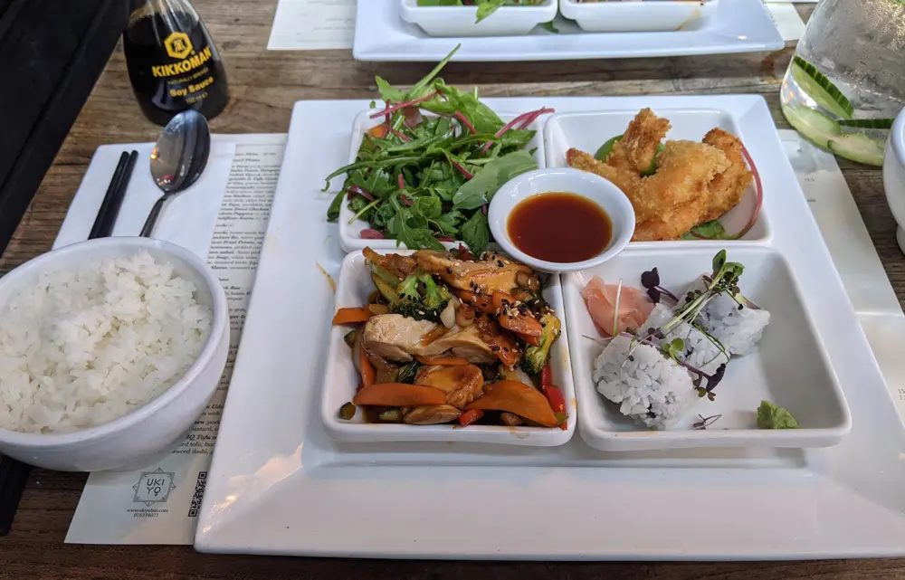 日替わりランチセットが12ユーロで、この日はチキンと野菜炒め、エビフライ、サラダとサーモンの海苔巻き、ご飯とお味噌汁。すごい量。