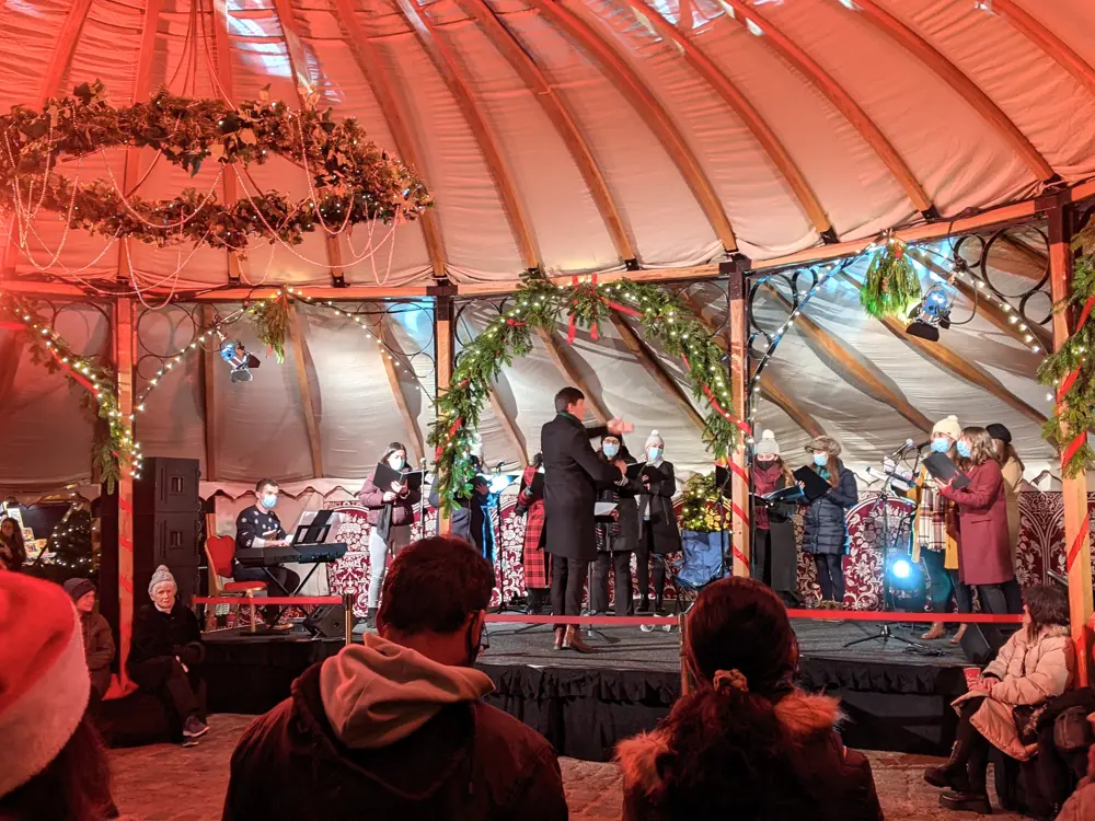 野外テントの中で聖歌隊がマスクをしながらクリスマスソングの数々を披露。「2年ぶりのコンサートです」と言っていた。