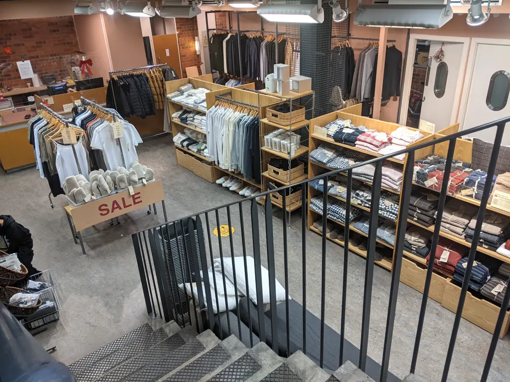 一階に文房具、雑貨、コスメ・ケア用品、階段の踊り場に収納用品、地階にはキッチン用品や洋服が売っている。食品類は扱っていない。