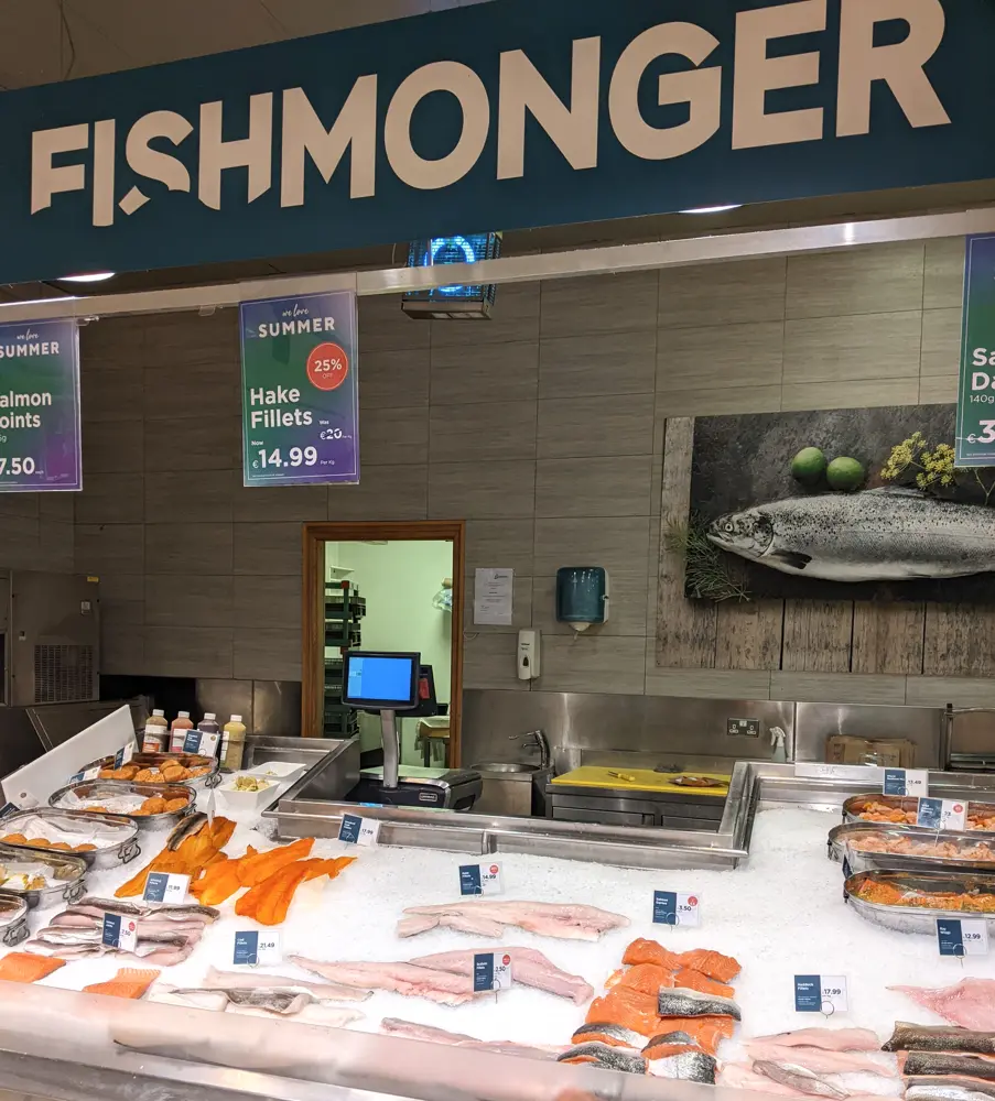 私のよく行く大型スーパーの鮮魚コーナー(fishmonger フィッシュモンガーは魚屋のこと)。夕方にこの写真を撮ったせいもあるが、普段から扱う魚介類の種類は多くない。鮭 salmon、タラ cod、メルルーサ hake、キス whiting、マス trout、ホタテ貝 scallop、ムール貝 mussels、海老 shrimp、鮭やニシン kipper の燻製ぐらいだ。ときどきマグロ tuna も加わる。