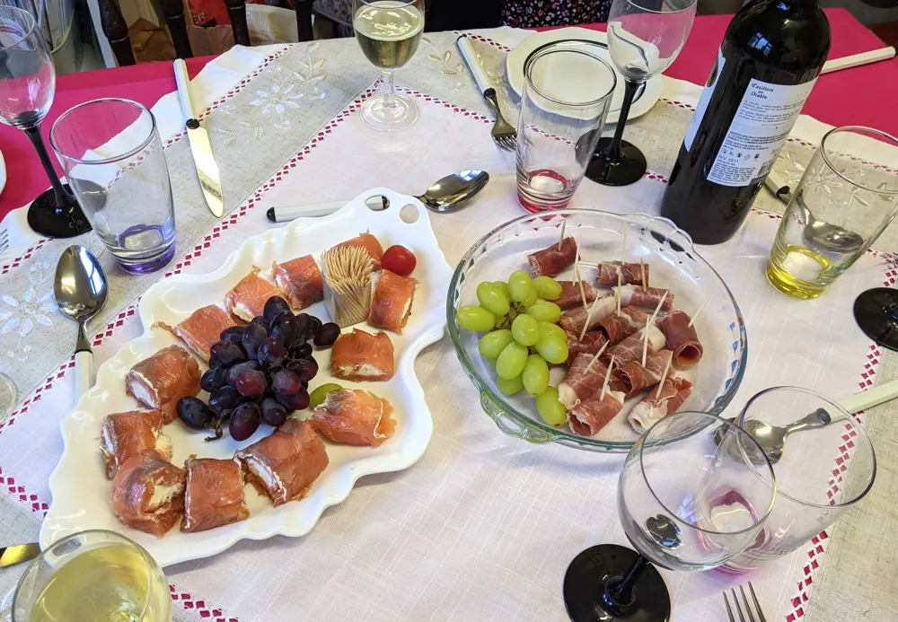 各家庭によってクリスマス料理の前菜はバラエティに富むが、夫の実家の定番はクリームチーズのスモークサーモン巻き。今年はそれにプロシュート(イタリア産生ハム)とぶどうが彩りを添えた。