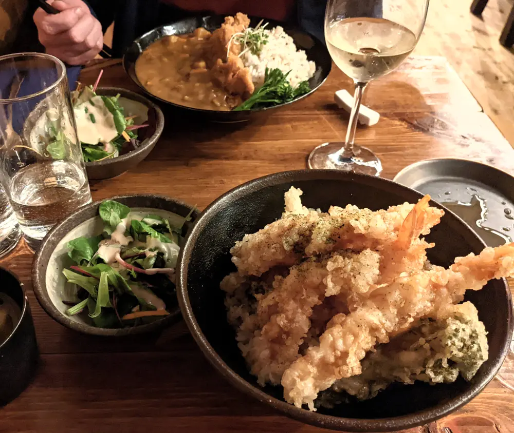 落ち着けるダブリンの居酒屋達磨 DARUMA でランチ。おなかがすいている人にはこの天丼のボリュームは嬉しい。チキンカツカレー(写真奥)は日本風のカレーが恋しい人にお勧め。