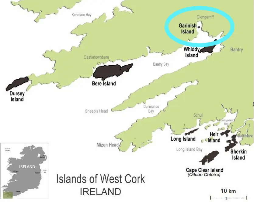 ウエストコークにはいくつもの島が浮かぶが、ガーニッシュ島はその中でも約 15ヘクタール(東京ドーム 3つ分)と小さな島。グレンガーリフ Glengarriff という町から小さいフェリーか水上バスで約 15分でアクセスできる。(地図出典 https://westcorkislands.com/)