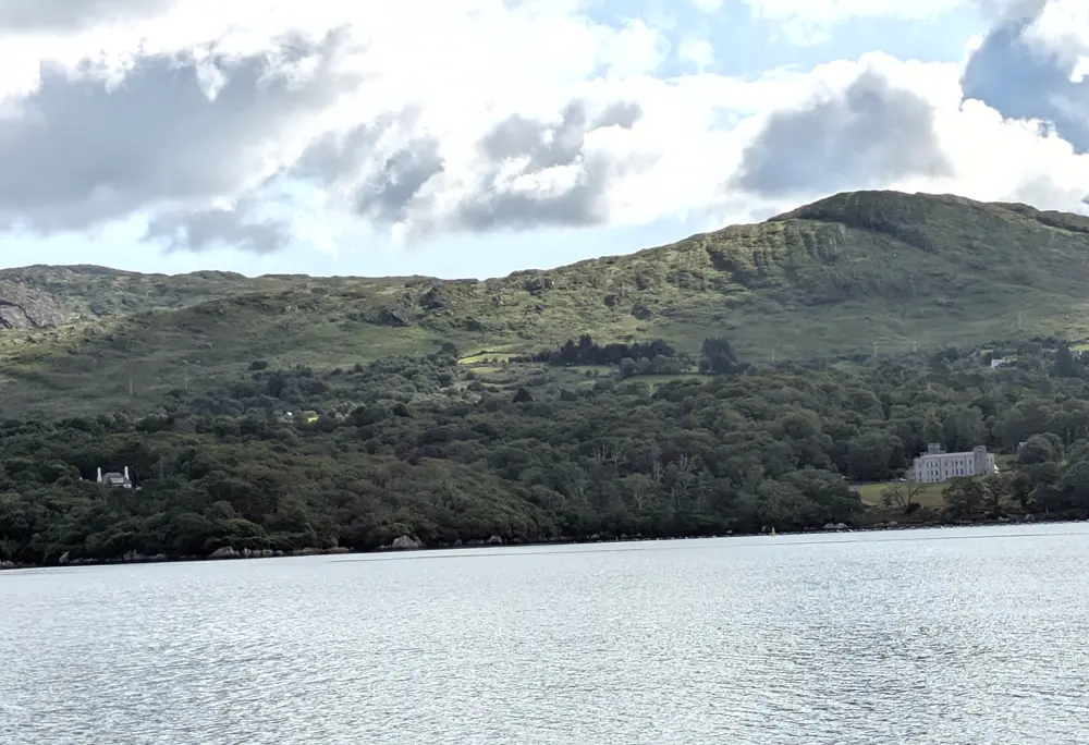 フェリーに乗り込み、出航後数分して本島をふり返ると、白い煙突が 2つついた家が見えた(写真左手)。アイルランドの誇る大女優モーリン・オハラのかつての邸宅だったとフェリーの乗組員が教えてくれた。写真右手にあるお城のような建物は、18世紀末に軍事目的で建てられたグレンガーリフ城 Glengarriff Castle。1970年代には高級ホテルとして栄えたが、近年は屋根のない廃墟となっていたのを最近北アイルランドのビジネスマンが購入。現在は修復工事が行われている。