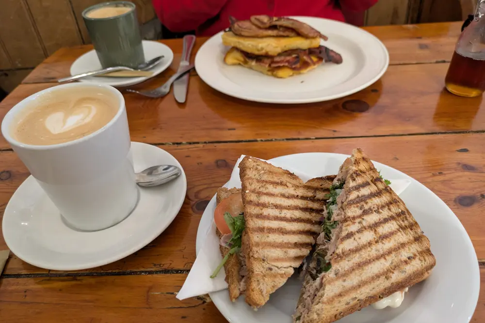 私はツナチーズトースト、ノーラはたっぷりベーコンの乗ったパンケーキ。ベーコンが多すぎて私に一枚くれました。