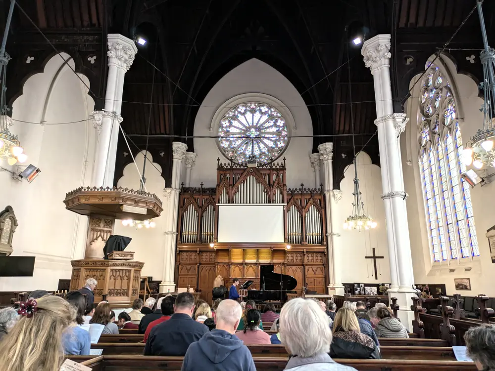 そして、先週の日曜日に行ってきました、移転して最初のコンサート。ヴィオラとピアノの二重奏だった。友人のノーラを誘って行ったが、彼女は教会の席に着席した途端、「あ、もう暖房がついているのね」と上方を見やった。確かに教会の左右の壁に赤外線ヒーターのようなものがいくつも取りつけられていて、オレンジ色の光を放っていた。