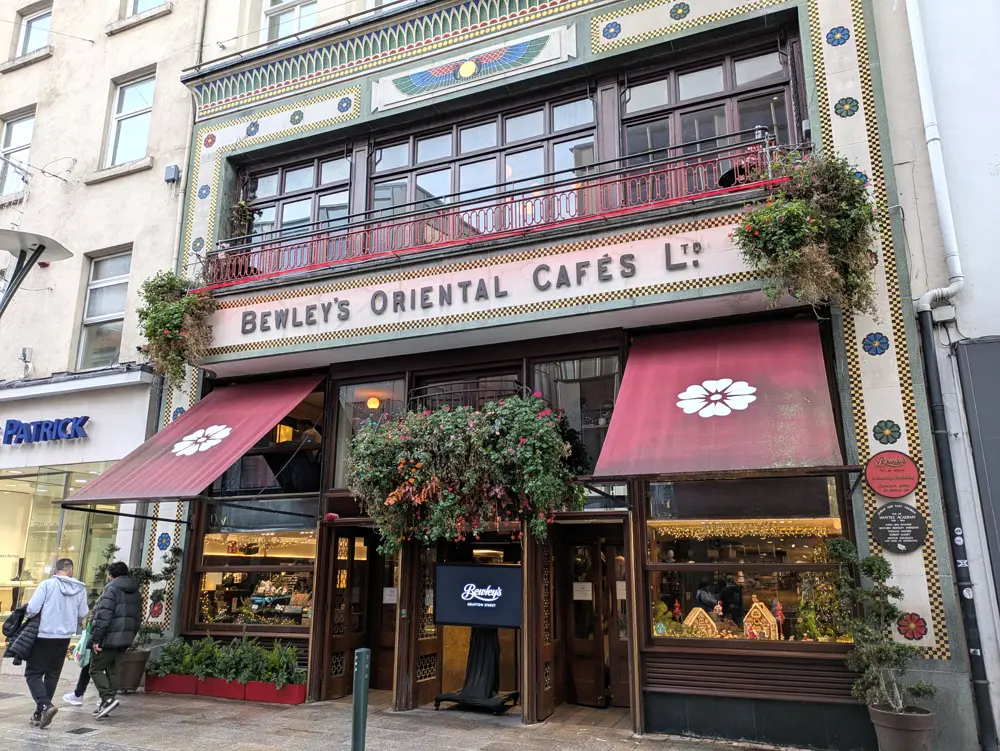 クリスマスの飾りつけが目につくダブリンの街中。グラフトン通りの老舗店、ビューリーズ・カフェのショーウィンドー。ジンジャービスケットの家がかわいい。