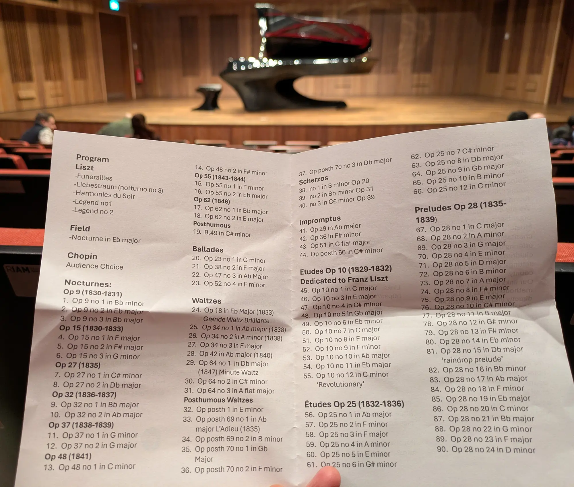 演奏プログラムにはショパンのピアノ作品 90曲が掲載されていた。休憩後、司会が「どの曲を弾いてもらいたいですか」と会場を見渡すとたくさんの人が挙手。瞬く間にリクエスト曲が決まっていった。