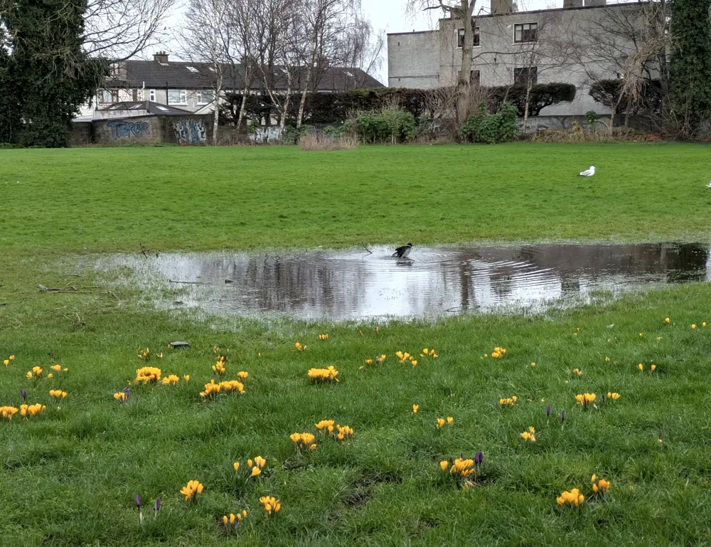 1月から雨続きのダブリンでは、わが家の最寄りのバス停の後ろの原っぱに池ができてしまいました。