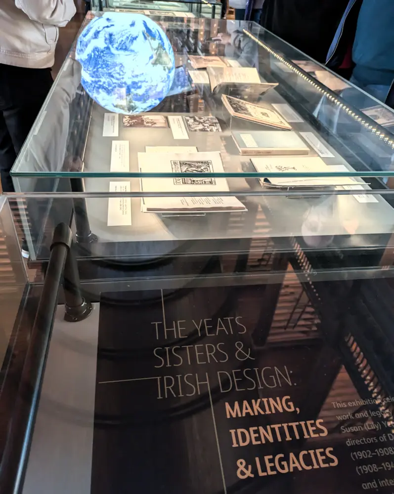 2024年9月、トリニティ大学の「ケルズの書」併設の特別展示。W・B・イェイツの姉妹たちの作品がアイルランドの美術デザインに与えた影響が「Legacies」という言葉を使って紹介されていた。